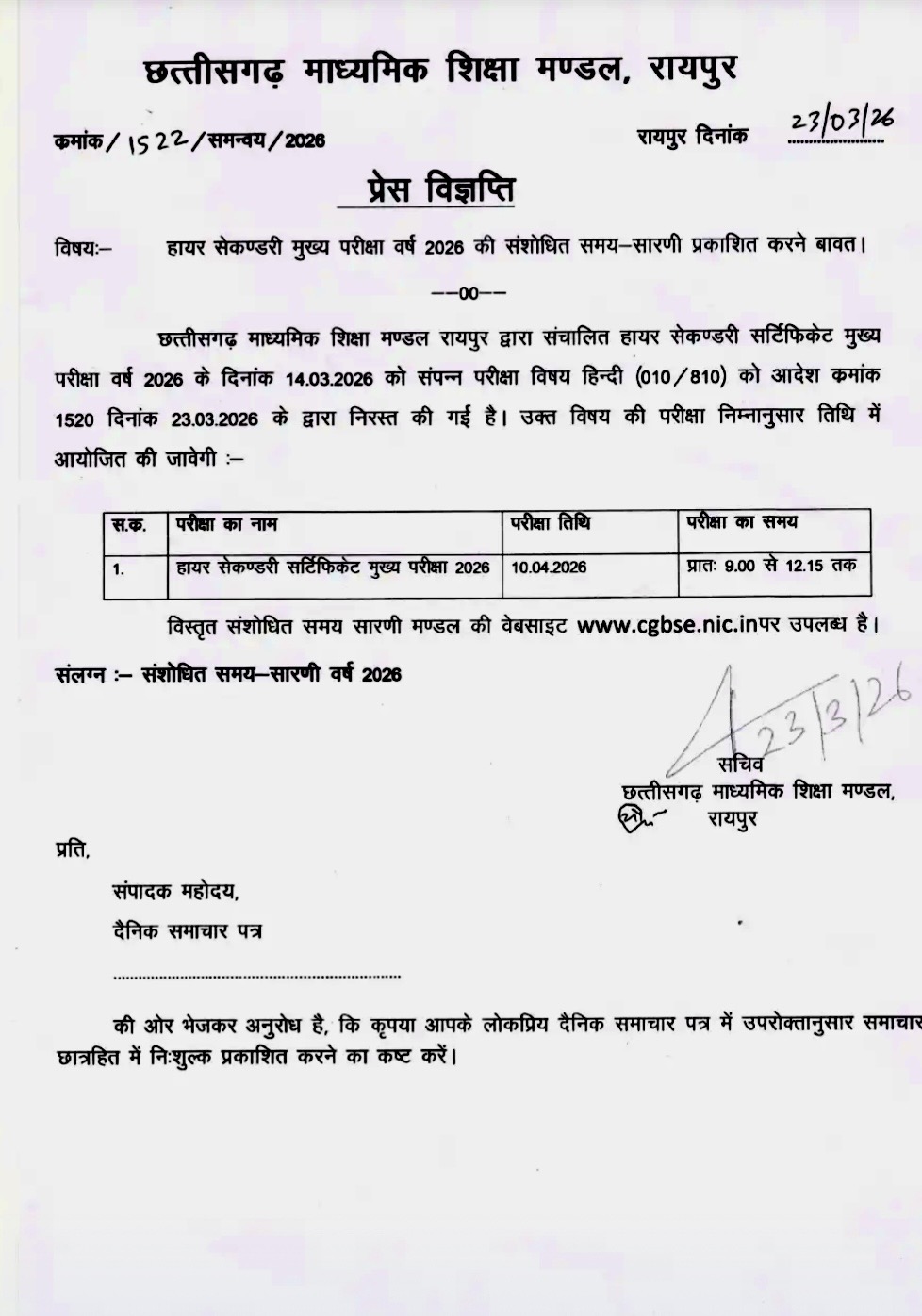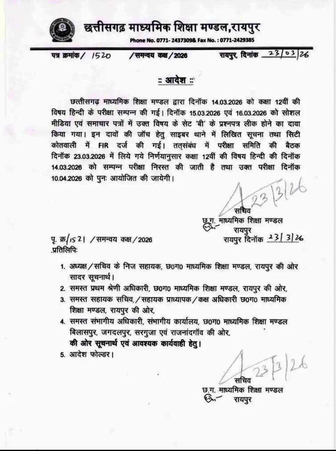 рд░рд╛рдпрдкреБрд░ред рдЫрддреНрддреАрд╕рдЧрдврд╝ рдорд╛рдзреНрдпрдорд┐рдХ рд╢рд┐рдХреНрд╖рд╛ рдордВрдбрд▓ (CGBSE) рдиреЗ 12рд╡реАрдВ рдмреЛрд░реНрдб рдХреА рд╣рд┐рдВрджреА рд╡рд┐рд╖рдп рдХреА рдкрд░реАрдХреНрд╖рд╛ рдХреЛ рддрддреНрдХрд╛рд▓ рдкреНрд░рднрд╛рд╡ рд╕реЗ рд░рджреНрдж рдХрд░ рджрд┐рдпрд╛ рд╣реИред рдпрд╣ рдирд┐рд░реНрдгрдп рдЙрд╕ рд╕рдордп рд▓рд┐рдпрд╛ рдЧрдпрд╛ рдЬрдм рдкрд░реАрдХреНрд╖рд╛ рд╕реЗ рдареАрдХ рдкрд╣рд▓реЗ рд╕реЛрд╢рд▓ рдореАрдбрд┐рдпрд╛ рдкрд░ рдкреНрд░рд╢реНрди рдкрддреНрд░ рдХреЗ рд╡рд╛рдпрд░рд▓ рд╣реЛрдиреЗ рдХреА рдкреБрд╖реНрдЯрд┐ рд╣реБрдИред