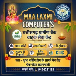 सरायपाली: शहर के निवासियों और आस-पास के ग्रामीणों के लिए डिजिटल सेवाओं और बैंकिंग कार्यों को आसान बनाने के उद्देश्य से ‘माँ लक्ष्मी कंप्यूटर्स’ (छत्तीसगढ़...